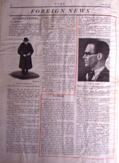 | TIME Magazine (U.S.A.). April 10,1933FOREIGN NEWS --- RUSSIA- - - Crusts on the FloorGareth Jones, a serious young man with glasses, arrived in Berlin last week after a three-week tour of the Ukraine. He had a dreadful tale to tell, and Berlin correspondents listened politely because serious Mr. Jones was once a private secretary to David Lloyd George and before making his trip to the Ukraine he spent many a long hour learning to speak Russian - far more fluently than most Russian correspondents. Said he: “I walked through the country visiting villages and investigating twelve collective farms. Everywhere I heard the cry: ‘There is no bread, we are dying!’ This cry is rising from all of Russia from the Volga district, from Siberia from White Russia from Central Asia and from the Ukraine black dirt country. “Most officials deny any famine exists, but a few minutes following one such denial in a train I chanced to throw away a stale piece of my private supply of bread. Like a shot a peasant dived to the floor grabbed the crust and devoured it. The same performance was repeated later with an orange peel. Even transport and G.P.U. officers warned me against travelling over the countryside at night because of the numbers of starving, desperate men . . . A foreign expert who returned from Kazakstan told me that 1,000,000 of the 5,000,000 of inhabitants there have died of hunger. “After Dictator Josef V. Stalin the starving Russians most hate George Bernard Shaw for his accounts of their plentiful food . . . There is insufficient feed and many peasants are too weak to work on the land and the future prospect seems blacker than the present. The peasants no longer trust their government and the change in the taxation policy came too late." A rebuttal was promptly presented by Walter Duranty, a U.S. correspondent long in Soviet good graces, but it was a rebuttal of much mildness. "The number of times foreigners, especially Britons have shaken rueful heads as they composed the Soviet Union’s epitaph can scarcely be computed This not to mention a more regrettable incident of three years ago when an American correspondent discovered half the Ukraine flaming with rebellion and proved it by authentic documents eagerly proffered by Rumanians. . . “Since I talked with Mr. Jones I have made exhaustive inquiries about this alleged famine situation . . . There is serious food shortage throughout the country with occasional cases of well-managed state or collective farms. The big cities and the army are adequately supplied with food. There is no actual starvation or death from starvation, but there is wide is mortality from diseases due to malnutrition . . . In every Russian village food conditions will improve henceforth, but that will not answer one really vital question - What about the coming grain crop upon that depends not the future of the Soviet power which cannot and will not be smashed, but the future policy of the Kremlin.