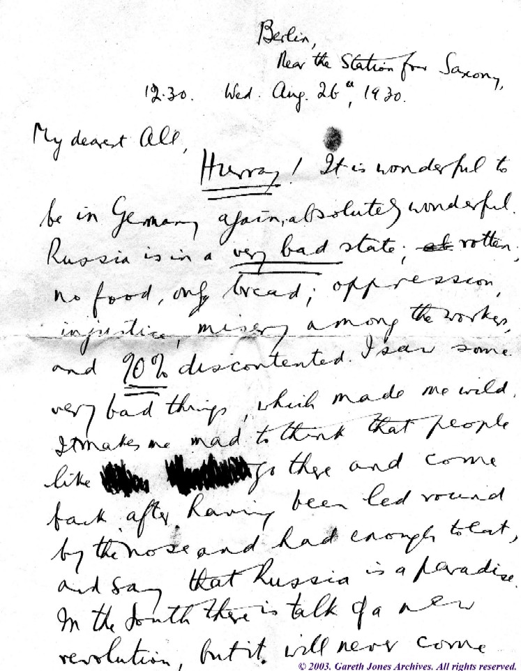 Gareth's personal four page letter of August 26th, 1930, to his parents from the safety of Berlin after leaving the USSR, where he predicted 'many deaths' through 'starvation' (as a result of the Five-Year Plan).