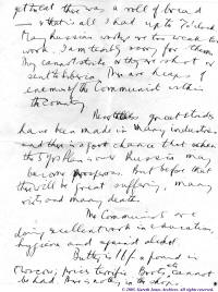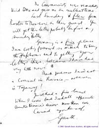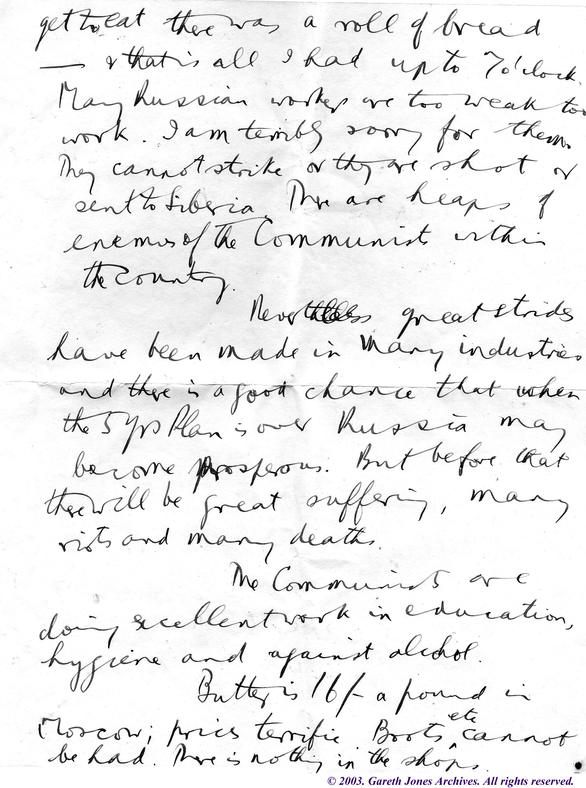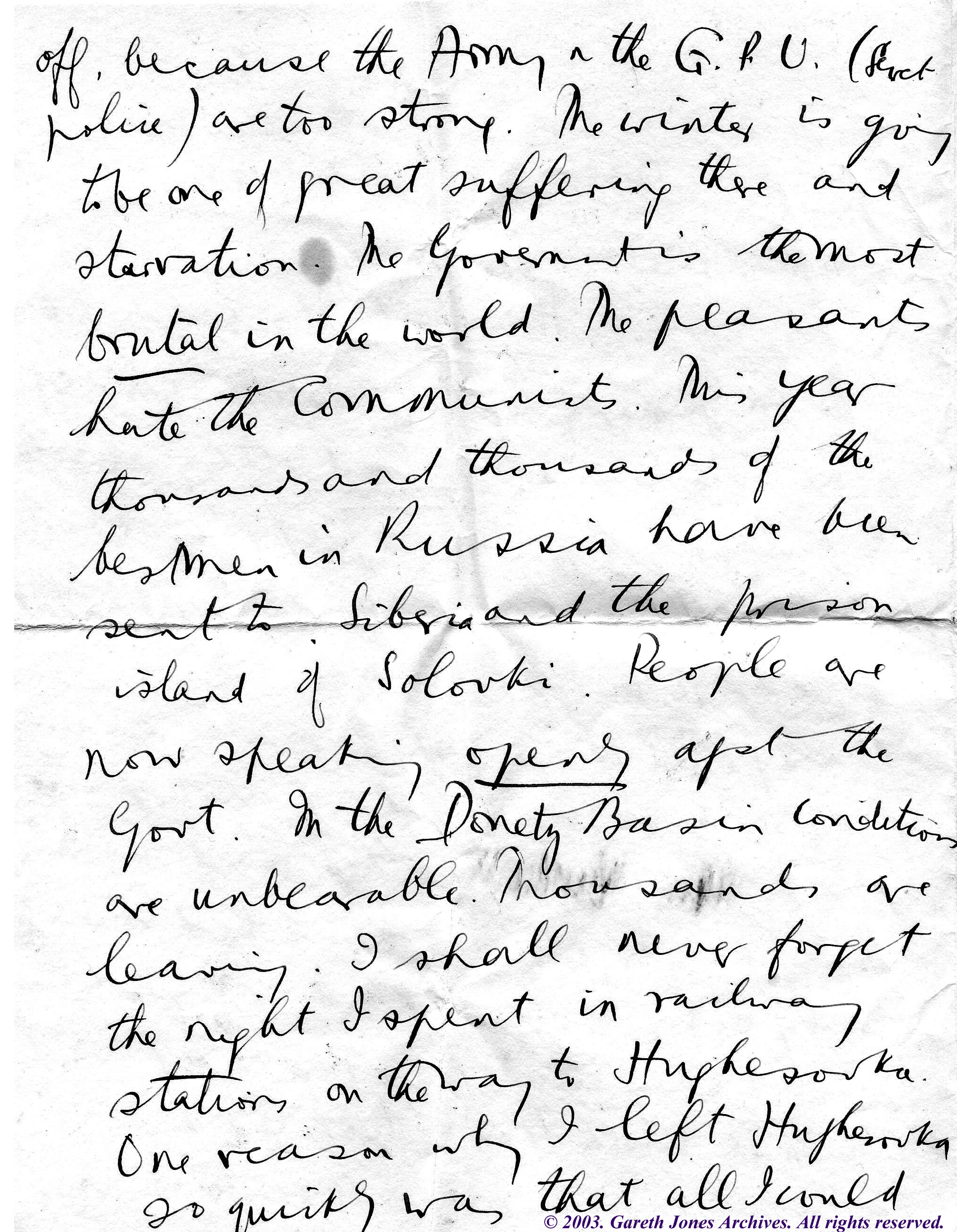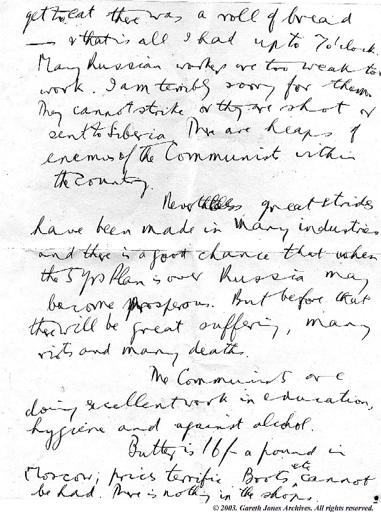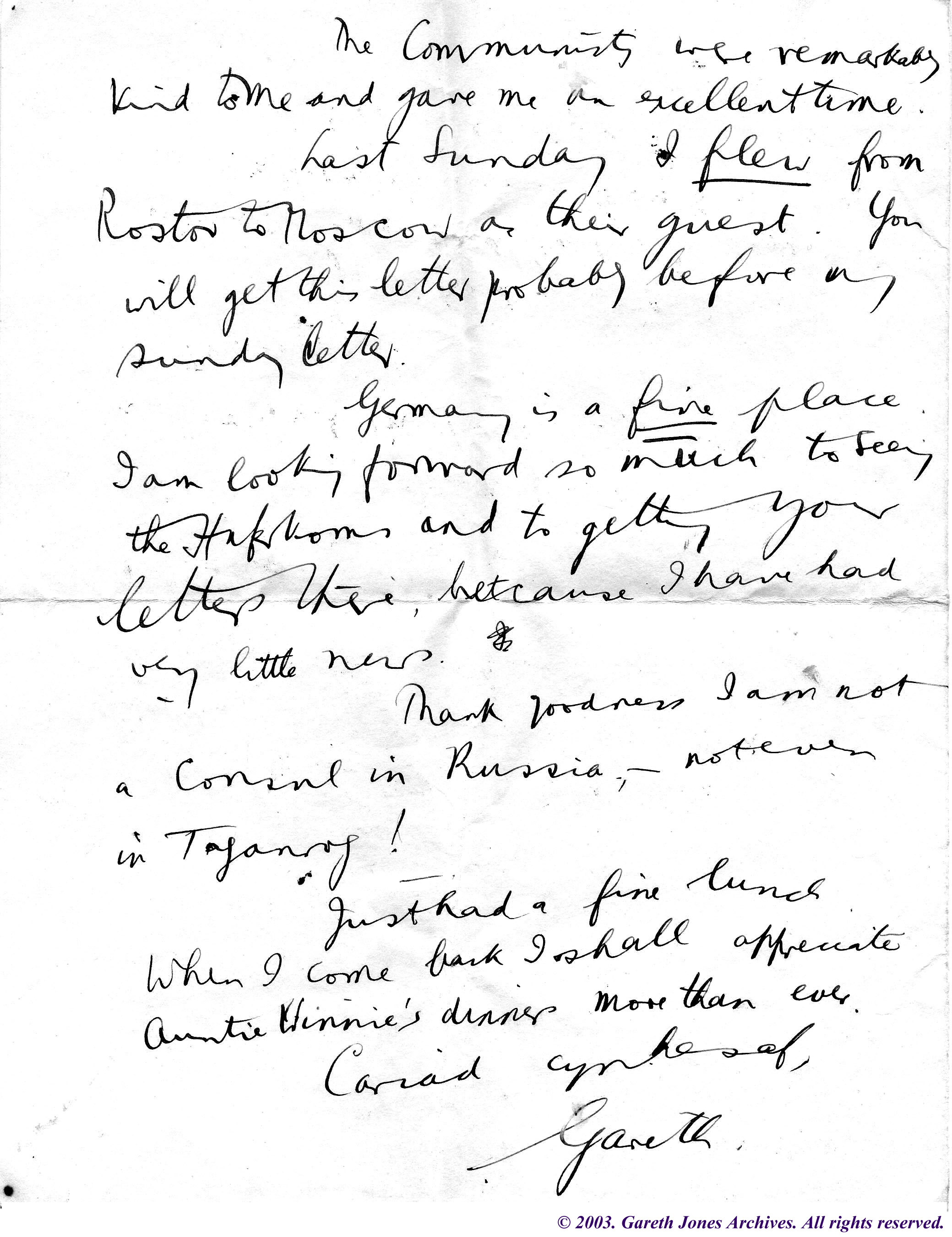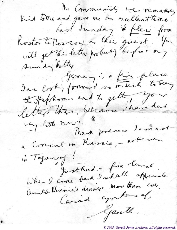 [N.B. The small 'censorship' on the first page was made for unknown reasons by Gareth's mother, which we strongly believe reads 'G.B. Shaw' (George Bernard Shaw), who had just visited Moscow with Lady Astor, and to whom Gareth repeats this sentiment in his Berlin Famine Press Release in March 1933. (This could if necessary be proven scientifically at a later date).] Full Transcript of above letter: Hurray! It is wonderful to be in Germany again, absolutely wonderful. Russia is in a very bad state; rotten, no food, only bread; oppression, injustice, misery among the workers and 90% discontented. I saw some very bad things, which made me mad to think that people like [the Webbs (Sydney and Beatrice Web)] go there and come back, after having been led round by the nose and had enough to eat, and say that Russia is a paradise. In the South there is talk of a new revolution, but it will never come off, because the Army and the O.G.P.U. (Soviet Police) are too strong. The winter is going to be one of great suffering there and there is starvation. The government is the most brutal in the world. The peasants hate the Communists. This year thousands and thousands of the best men in Russia have been sent to Siberia and the prison island of Solovki. People are now speaking openly against the Government. In the Donetz Basin conditions are unbearable. Thousands are leaving. I shall never forget the night I spent in a railway station on the way to Hughesovka. One reason why I left Hughesovska so quickly was that all I could get to eat was a roll of bread –and that is all I had up to 7 o’clock. Many Russians are too weak to work. I am terribly sorry for them. They cannot strike or they are shot or sent to Siberia. There are heaps of enemies of the Communist within the country. Nevertheless great strides have been made in many industries and there is a good chance that when the Five-Year Plan is over Russia may become prosperous. But before that there will be great suffering, many riots and many deaths. The Communists are doing excellent work in education, hygiene and against alcohol. Butter is 16/- a pound in Moscow; prices are terrific, boots etc. cannot be had. There is nothing in the shops. The Communists were remarkably kind to me and gave me an excellent time. Last Sunday I flew from Rostov to Moscow as their guest. You will get this letter probably before my Sunday letter. Germany is a fine place. I am looking forward so much to seeing the Haferkorns and getting your letters there, because I have had very little news. Thank goodness I am not a Consul in Russia – not even in Taganrog! Just had a fine lunch. When I come back I shall appreciate Auntie Winnie’s [Gareth's 'live-in' aunt at his parent's home] dinner more than ever. Cariad cynhesaf Gareth