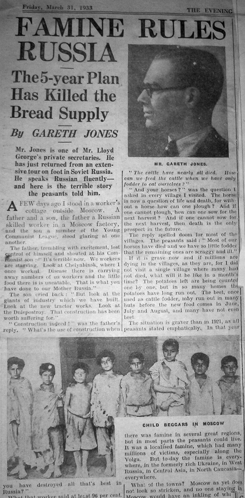 Excerpt revealing Famine Conditions from Gareth's Diary for 21st March 1933 Click on the above picture for more legible detail & transcript.. The following articles, all stem from Gareth's Berlin Press Conference on 29th March, exposing his discovery of widespread famine within the Soviet Union... New York Evening Post. Foreign Service. From Berlin, Wednesday March 29th 1933. Gareth's first famine report, filed by H. R. Knickerbocker, the 1931 Pulitzer Prize Winner.