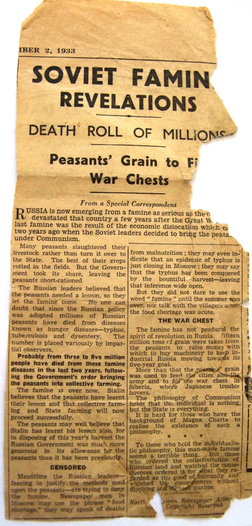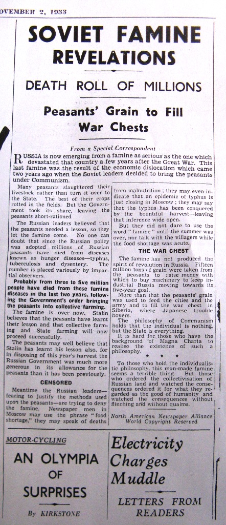 The London News Chronicle November 2nd 1933.Soviet Famine RevelationsDeath Roll of MillionsPeasants' Grain Fill War Chests