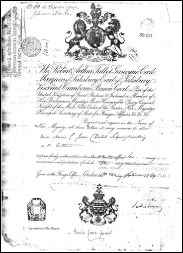 Miss Annie Gwen Jones’ Passport. On the reverse side is written: “It is essential to swear that we are all members of the English Protestant Church. Dissenters are not allowed to have passports for Russia. Mr Hughes had to state that I belonged to the English Church, which is not true you know. This is quite a new thing. Last time we had no nonsense of the kind.” Much has been said about the treatment of the Jews, they are the true victims of harsh laws, have no freedom or justice and are compelled to swear allegiance to the hand that punishes them. They were very numerous in Hugheffka and possessed two very large synagogues; their connection with us was very great as they almost had all the business of the community. They were unjustly said to be the cause of riots, which were not of rare occurrence. Their usual call to prayer is the triple knock and then they all repair to the synagogue. Sometimes the knock acts as a warning. They are watched and suspected by the Russians, so much are they hated that in one Russian City, Odessa, I believe a notice to this effect was posted up at a bathing establishment, “No dogs or Jews are allowed to bathe here”. I have to make a few remarks about their language coinage customs and a few other things. I shall touch on them briefly. The coinage is simpler than our coinage, you have to remember only Kopek and Rouble, the Kopek is about 1/4d and 100 kopeks are equal to one paper rouble, which is about 2/- 6d. Perhaps it would be interesting to know the various commodities, which were obtained from the large towns and brought to our place by means of a conveyance drawn by teams of oxen yoked together as in ancient times. Beef was very cheap, procured for 2d a pound, but the beef was so tough, ‘Proverbial leather’ was soft and sweet compared to it. Mutton was a trifle better. Turkeys and Geese could be had feathers and all for 1/-. Fowls for 6d, fish sold for 6 - 7 kopeks a pound, sturgeon, salmon, lampreys, eels, whitebait. Butter was fairly cheap, but rather scarce, the Russians do not care for butter. In several noblemen’s houses we were offered tea with bread made of rye sweetened with tiny sweets and no butter at all. Russians generally drink their tea in glass tumblers with glass saucers. No household is without its Samovar. The tea is very pale, but highly and deliciously flavoured, the addition of a slice of lemon vastly improves it. Some like their tea sweetened with jam not sugar, it is well known that Russia pays the best price for China Tea and thus gets the pick of the market, it comes overland not by sea. Our dainties were very expensive. Sardines were 2/- or so a tin which would cost 5 pence at home, caviar, if fresh is also rather dear, it consists of the roes of sturgeon, dried and salted, it is a favourite meal with the Russians. Caviar is spread on black bread with a glass or two of vodka. A little meal, called a Zakouska, is generally partaken of before dinner and never fails to give a good appetite. It is always spread on a side table before the usual dinner begins and is considered an indispensable thing as a preliminary to a feast of a great many courses. Wines of all sorts are found n the table of the upper classes. Another favourite dish is the suckling pig and you generally had one in every house at Easter time. Fruit is very cheap indeed, especially grapes, melons and peaches, game is plentiful, especially partridge and pheasant. Dress material, when it was your good fortune to come across any, was exorbitant in price. Often would Tartars, Greeks, Jews and Russians travel from place to place with their stock of goods, silk, lace etc. Russian lace is very beautiful indeed, in some villages the peasants are all occupied in making lace by hand. There is one most peculiar custom the Russians have and on a certain Saints day they all congregate at a cemetery, take their Samovars and cakes and have a meal on the gravestones of their departed friends and relatives, it is their kindness that prompts them to do that they think that the spirits come to join them in their feasting. The dominant population of Russia is Slavonic, the Slays are divided into two branches, one branch in Poland, Bohemia and Moravia and the other composed of Bulgarians, Serbians and two or three small tribes known as Croatians and Slovaks. Even at present anyone more or less acquainted with modern Russian has no difficulty in understanding a Pole, Bulgarian or Serbian. The language used 1000 years ago is still used in the service of the Russo-Greek church, is of course as unintelligible to the Russians now as Anglo-Saxon would be to the English. I have said nothing about poetry and prose; the names of Tolstoy, Pushkin, Turgenieff, Lermostoff, Gogul, Gorky are of European fame. I have touched on some points, which interested me during my stay in South Russia. I left Hughesovka just a week before the Cholera riot made its appearance there, taking as its victims several of nay Russian friends, but a fortnight before the terrible Cholera riots at Hughesoffka reported in the London Papers during which a great part of the village was burnt, the most valuable machinery of the works destroyed and numerous lives lost. This riot was found to have been instigated by the Nihilists. I have always advocated friendship with the Russians for in spite of their faults they have excellent possibilities and I have always felt that we Britishers could be the means of enlightening them and bringing happiness and prosperity to them. There is a great want in rural Russia of doctors, hospitals and nurses; the death rate is very high. The poor quality and insufficient food prepared the way for disease which is further prompted by the want of cleanliness, lack of sanitation and medical help. At the best of times the peasant is poorly fed and liable to skin trouble, asthma, typhoid and smallpox. When scarcity prevails they die in their thousands of hunger and a special form o